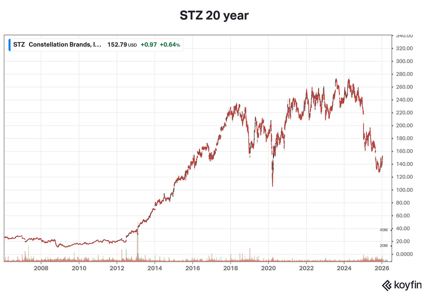 To see why the panic is so high, you only have to look at the “industry proxy.” In the world of finance, we look for a stock that represents the “mood” of a sector. For beer, that’s often $STZ Constellation Brands. The company that gobbled up craft breweries that were proudly independent, including the face melting acquisition of Ballast Point Brewing in 2015 for 1 billion freaking dollars. The sale that was was the spark that became the inferno of every mid-major craft brewer dreaming of a 10 figure buy out. Constellation sold Ballast Point for a mere 41 million only 4 years later.